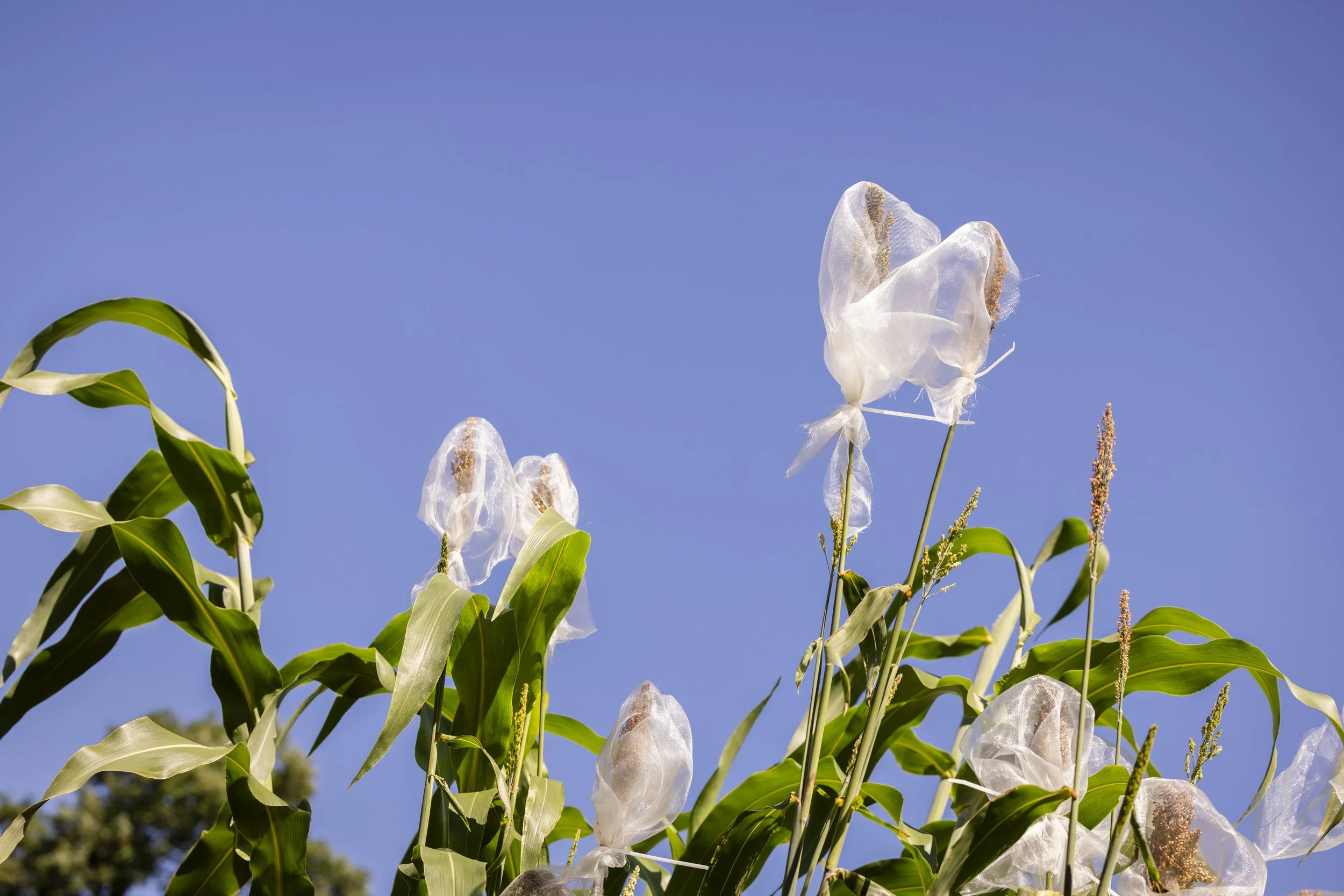 The tops of the sorghum heads covered in mesh baggies to protect them from the greedy birds.